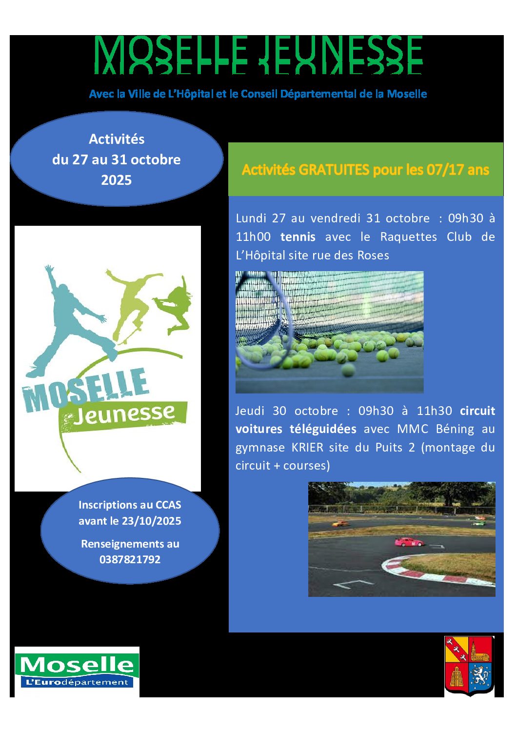 La Ville de L’Hôpital, en partenariat avec le Conseil Départemental de la Moselle, renouvelle l’opération Moselle Jeunesse proposée par le Centre communal d’action sociale durant les vacances de la Toussaint