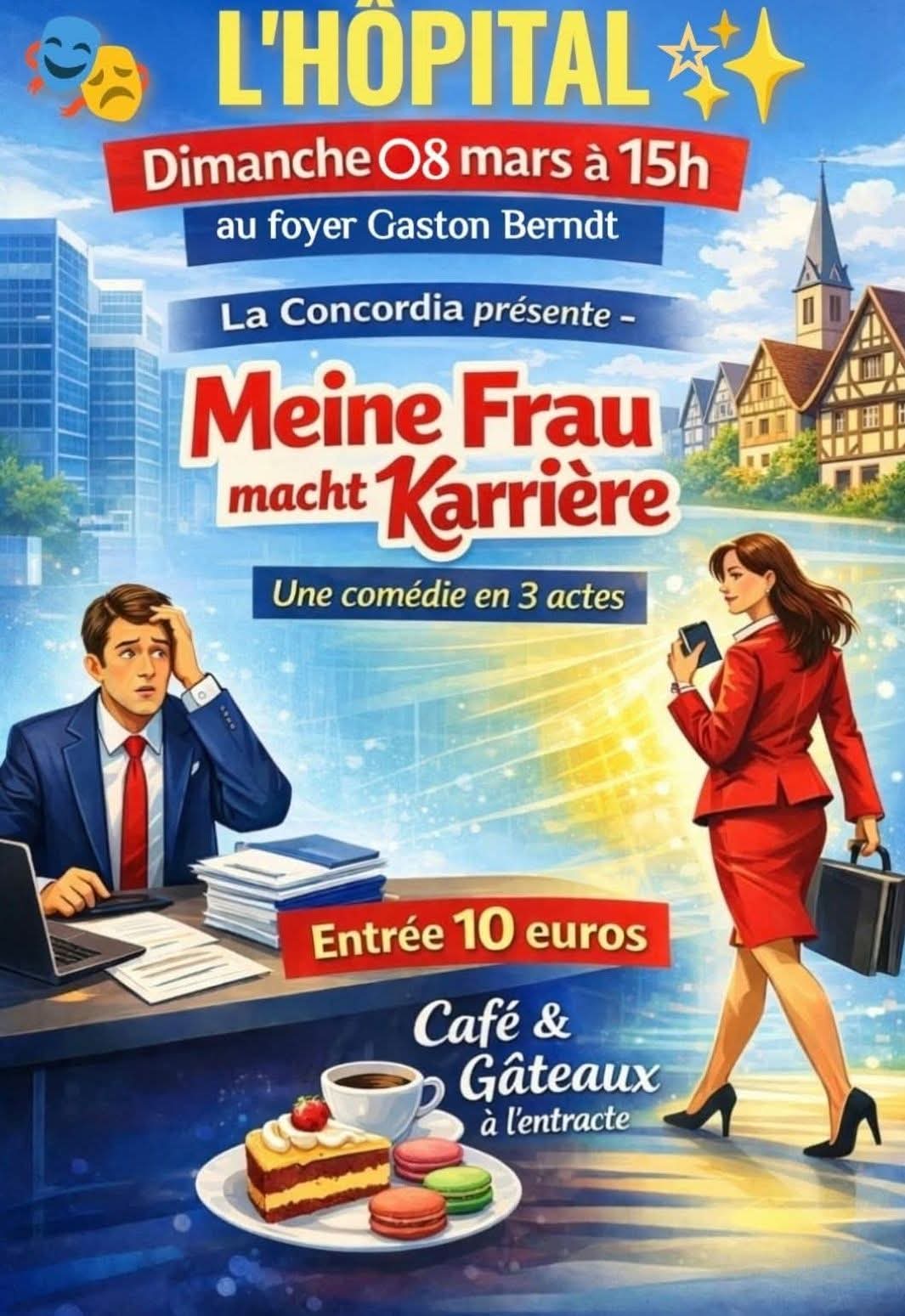 La troupe CONCORDIA vous présente sa nouvelle pièce de théâtre en platt « Meine Frau macht Karriere« , Dimanche 8 Mars 2026 à 15h00 au Foyer Gaston Berndt.